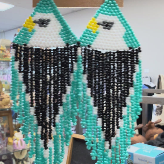 Celebrate Alaska’s wild beauty with these handcrafted Alaska Bald Eagle Bead Earrings. Featuring a detailed beaded design of the iconic bald eagle, these earrings capture the strength and spirit of Alaska’s most famous bird. The striking turquoise background and flowing bead fringe evoke Alaska’s skies, waters, and coastal landscapes.