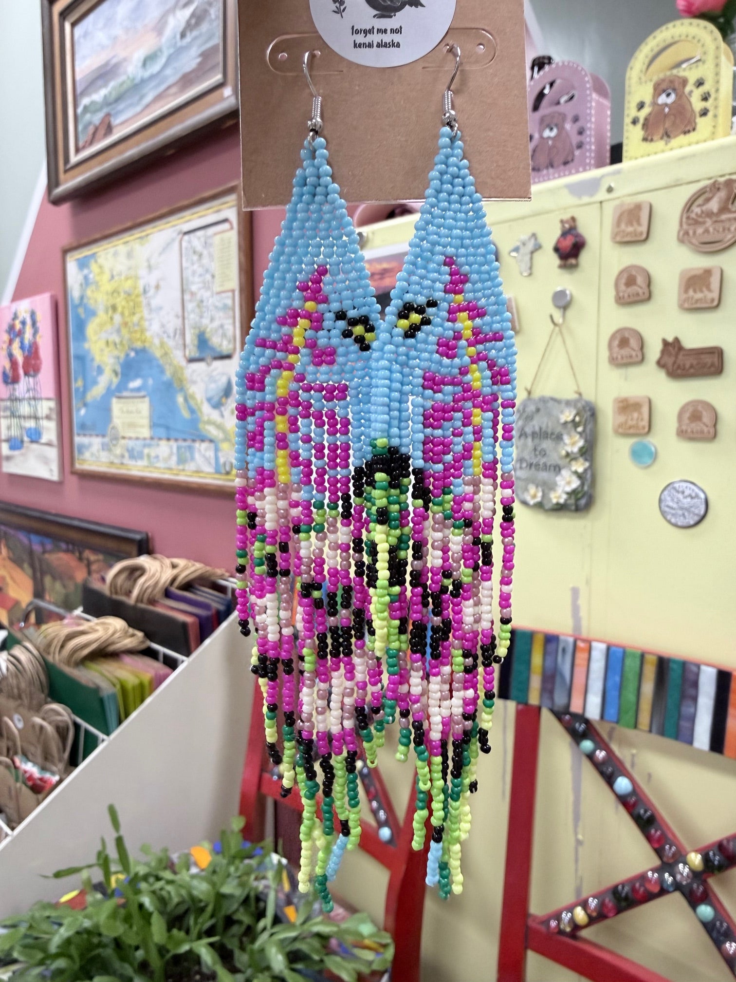 Inspired by Alaska’s iconic fireweed blooms, these hand-beaded earrings capture the vibrant beauty of summer along northern trails and riverbanks. Cascading strands of pink, green, and soft black beads echo fireweed’s tall stalks and delicate blossoms swaying against open blue skies...