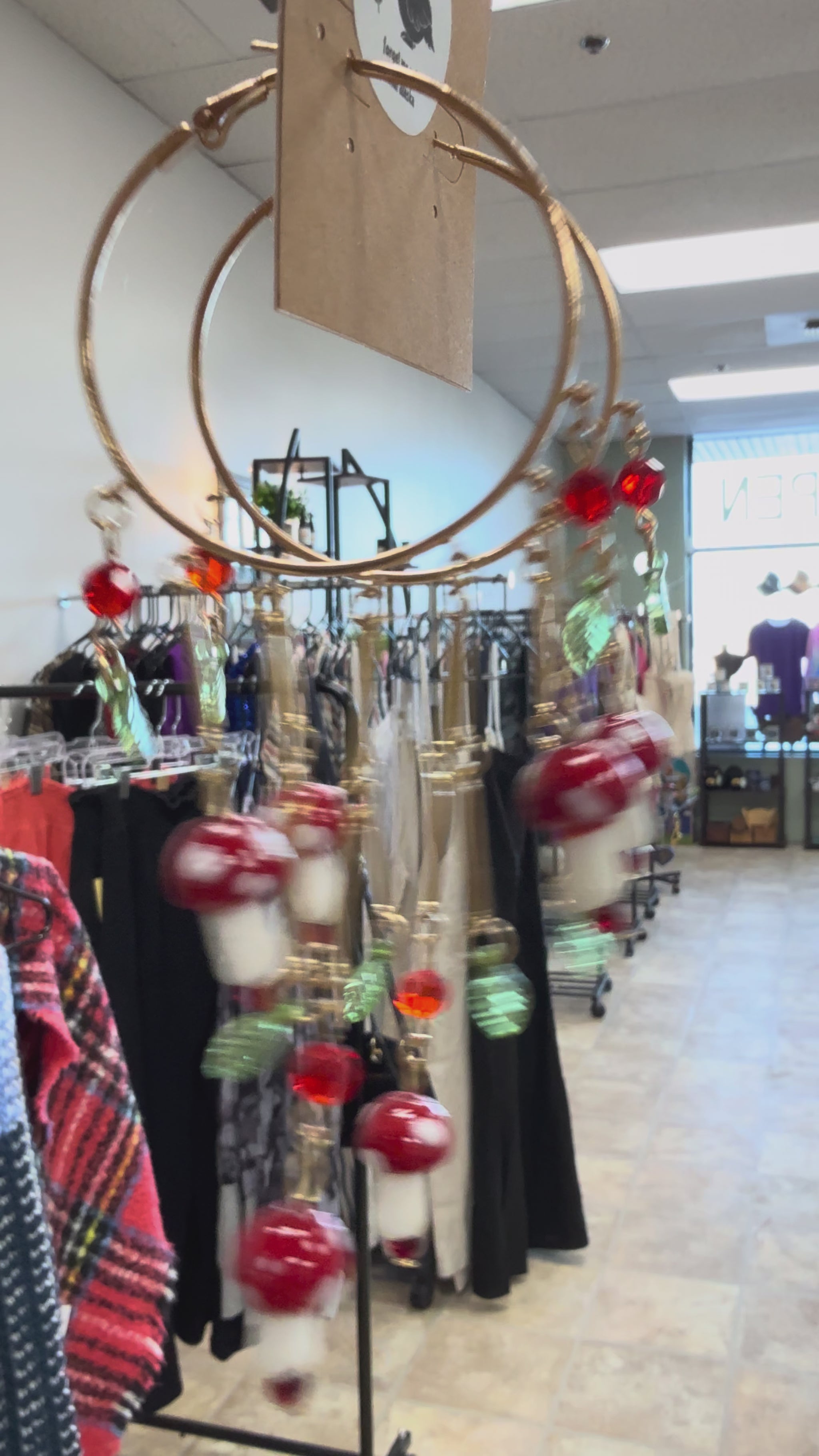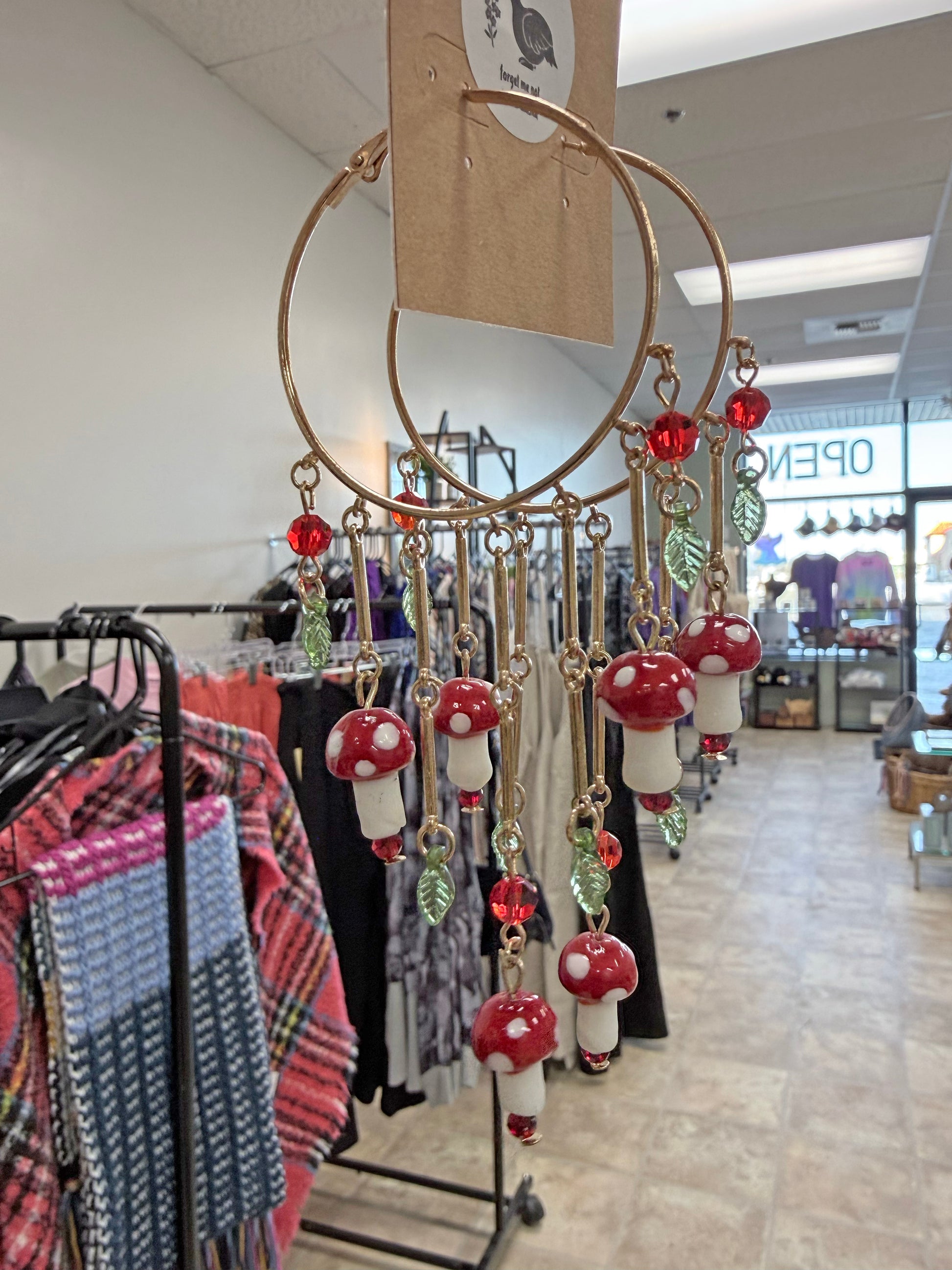 The delicate dangling elements create gentle movement, echoing the way mushrooms appear in clusters—small, hidden treasures waiting to be discovered along shaded trails. Gold accents add a hint of woodland sunlight filtering through the canopy above.