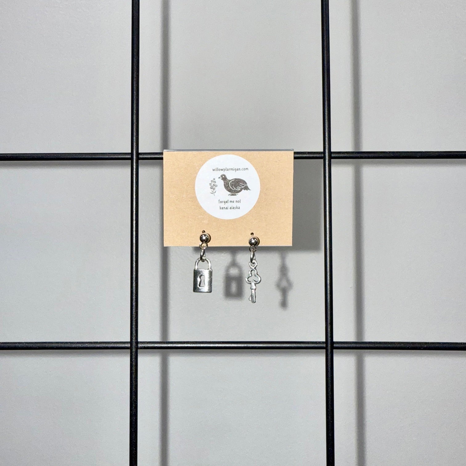 Charming antiqued silver lock with heart shape cutout and key post earrings. These mismatched earrings exude timeless charm, elegance and mystery!