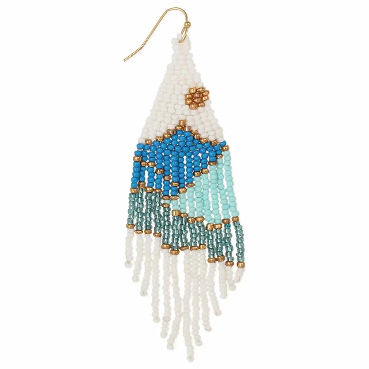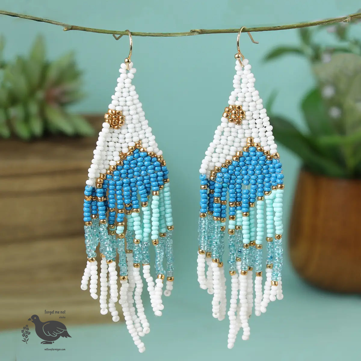 Gorgeous glass seed beaded earrings with blue glacier glow design. White woven seed bead fringe earring includes gold, turquoise and light blue beaded design inspired by the golden sun light sparkling on the glacier ice and waters of Alaska.