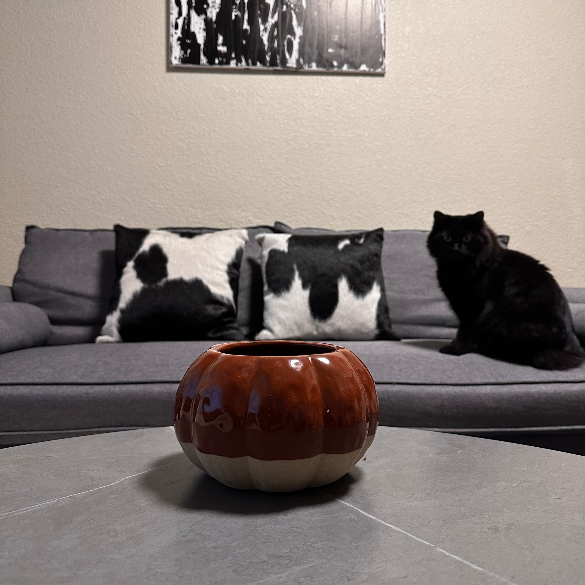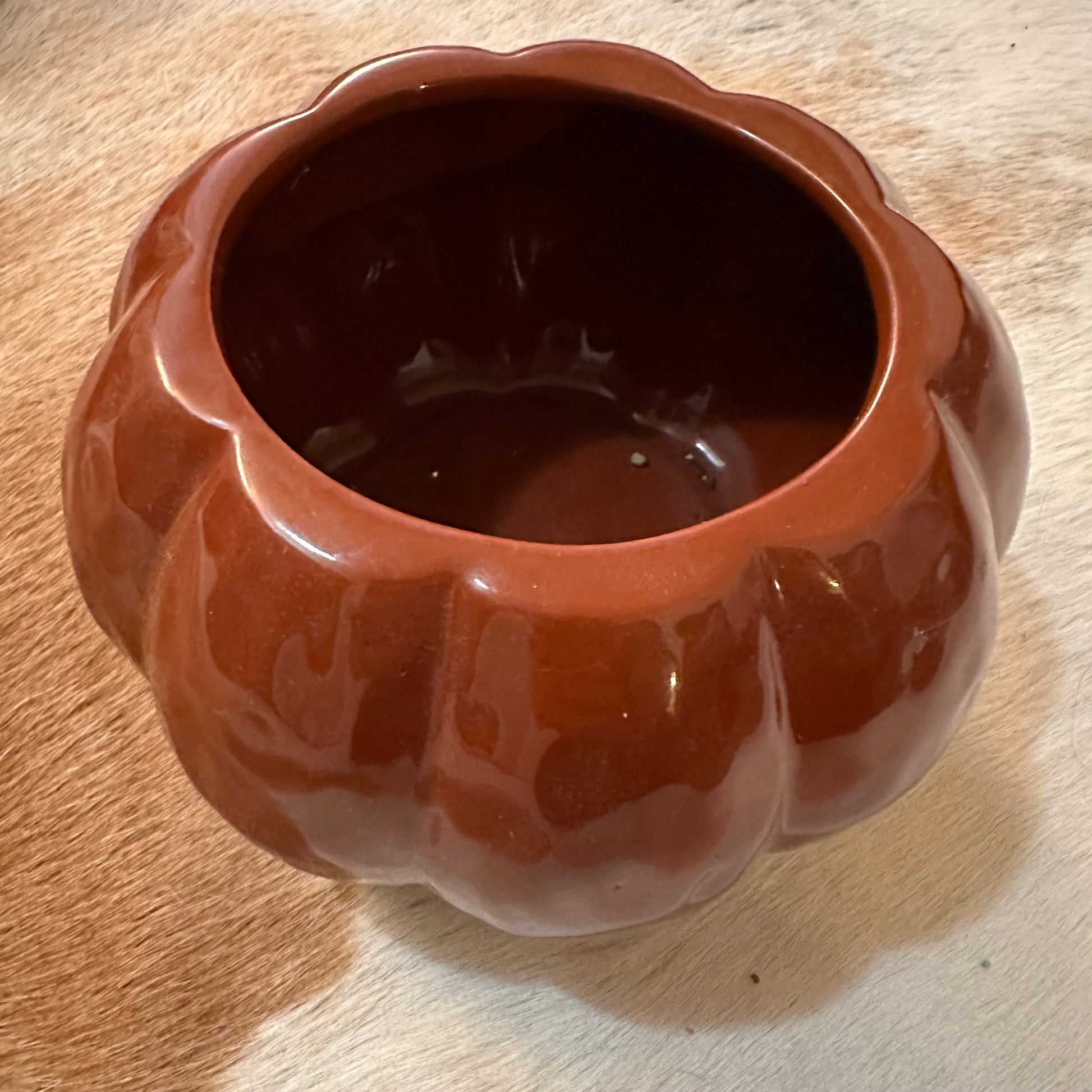 Measures 4" height x approx 9" at the widest diameter, tapers at the opening and base.