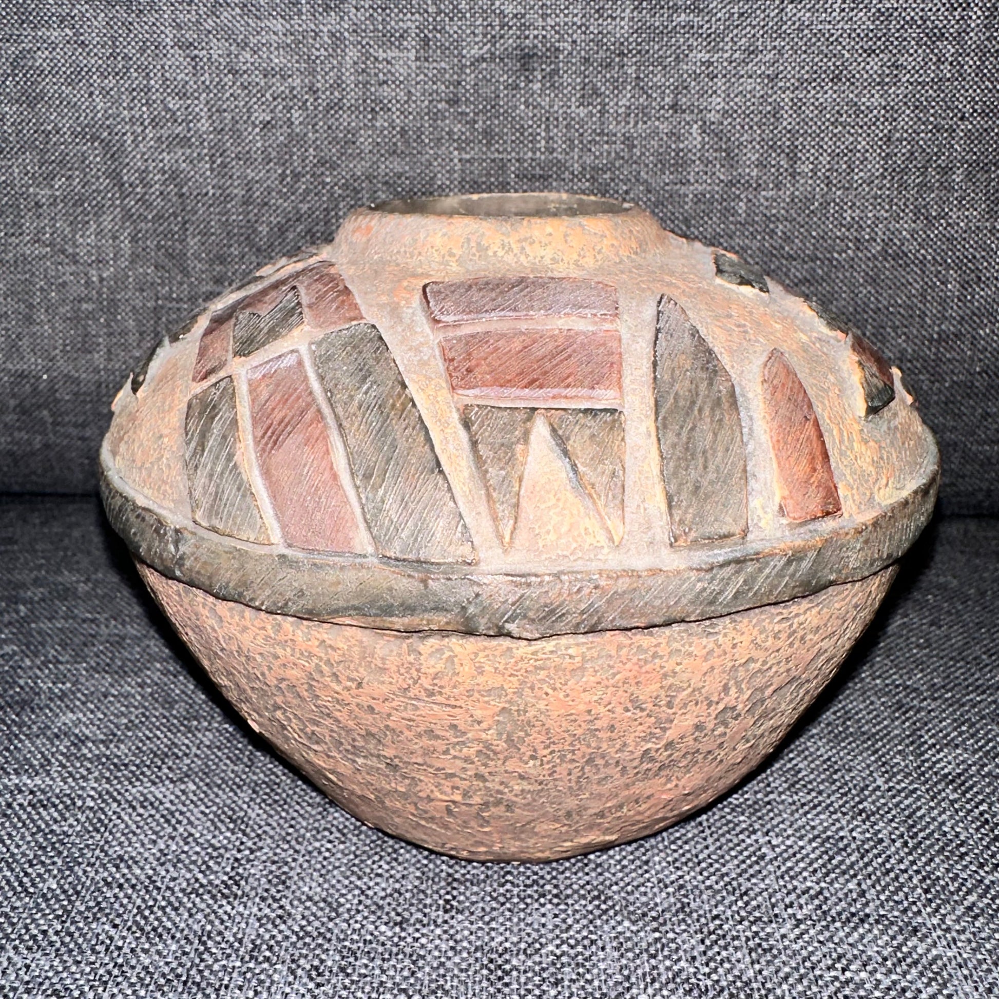 Measures 4" height x approx 6" at the widest diameter, tapers at the opening and base.