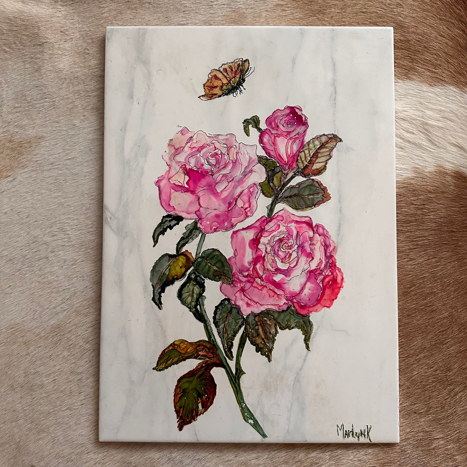 Butterfly & Roses Hand Painted Tile Art by local Artist Marlyn K