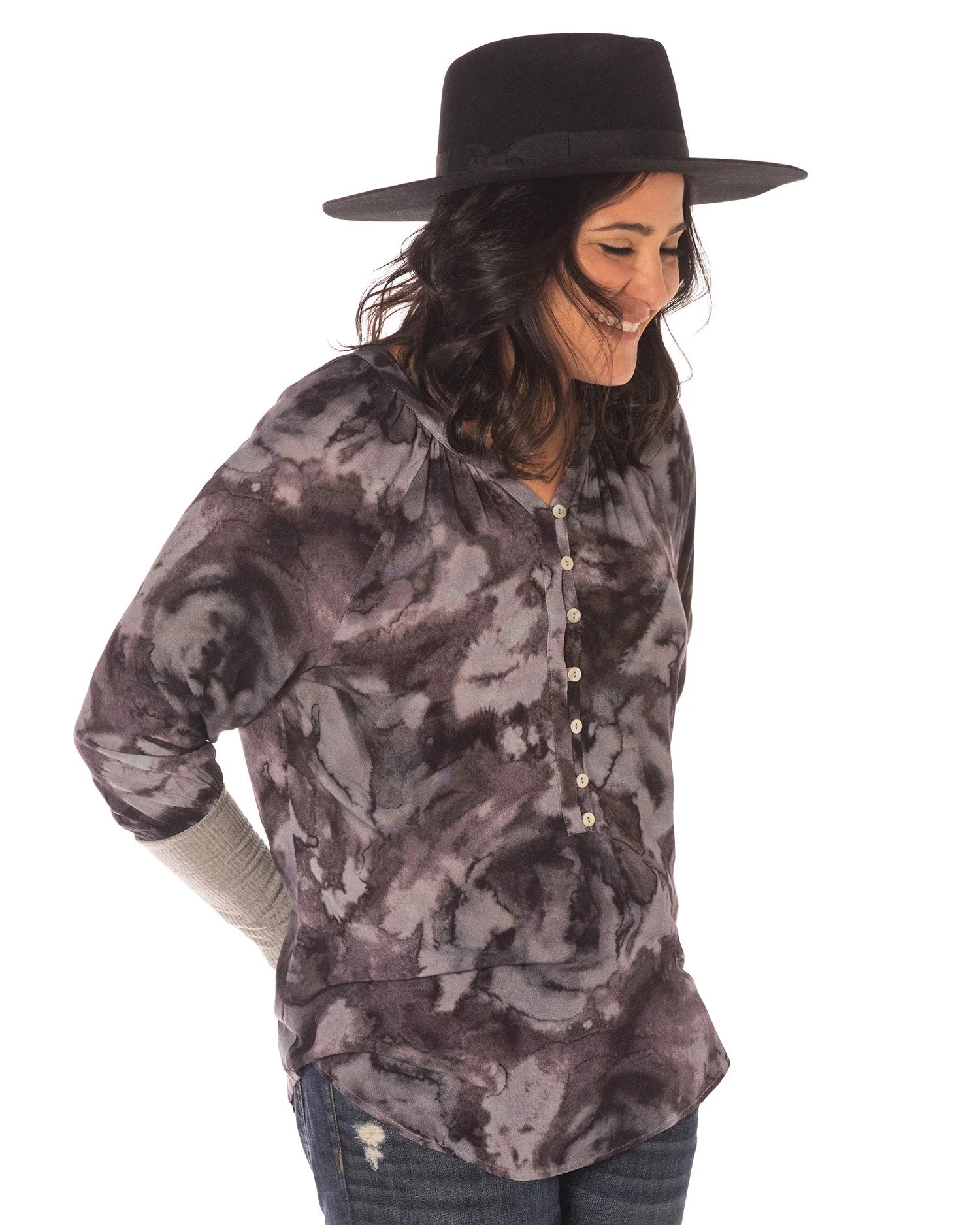 This rayon crepe fabric is tie dyed in soft colors and detailed with a ribbed knit hem and cuff. Featuring a slight balloon sleeve and raglan style hem sleeve, we love this elevated take on a crew sweatshirt.