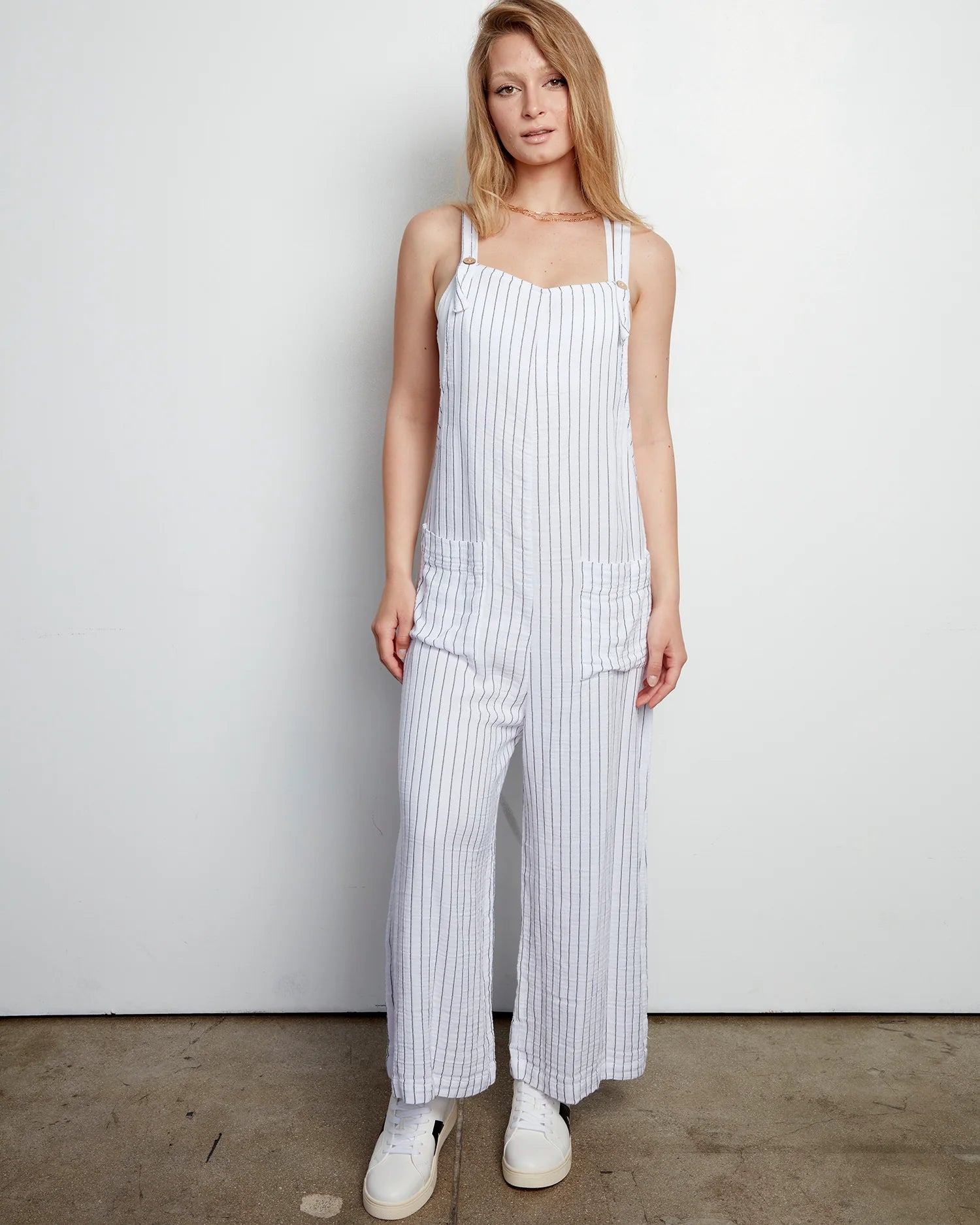 STRIPES! the overall with adjustable button straps, front pockets and a wide crop leg.